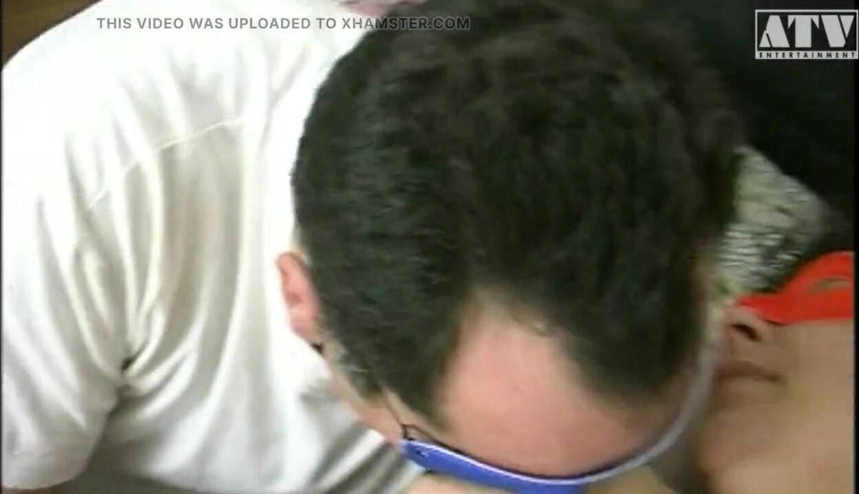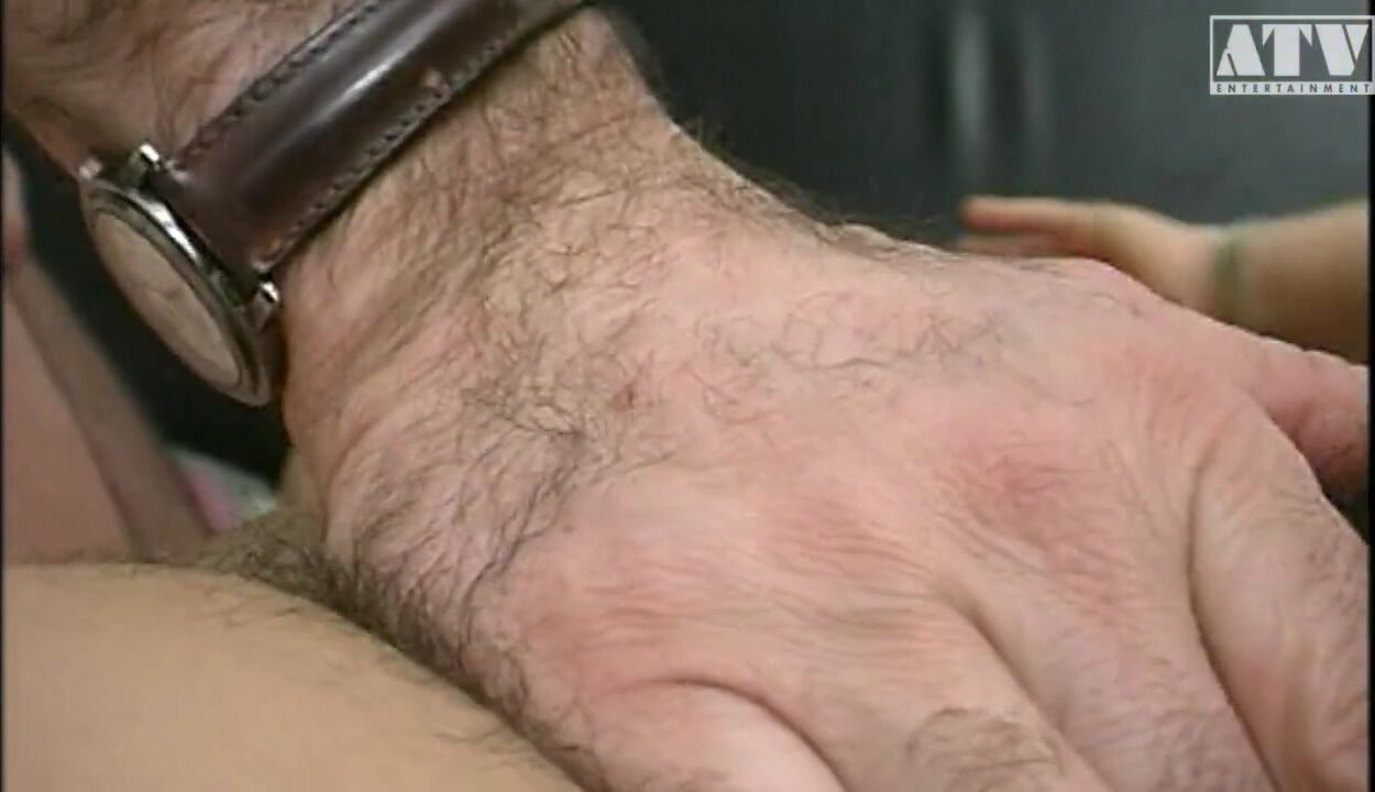 Der haarige Mann streichelt mit den Fingern die unrasierte Muschi seiner Herrin, während er ihr einen Fang gibt und in den Mund spritzt