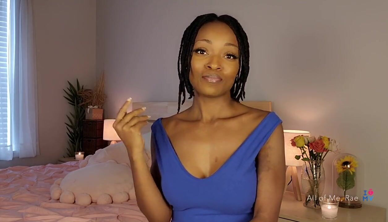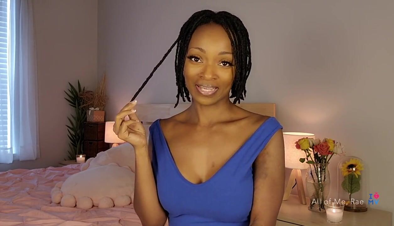 Eine dreißigjährige schwarze Frau mit kurzen Dreadlocks zeigt einen Blowjob und zeigt, wie man einen Strap-on eines Mannes hat