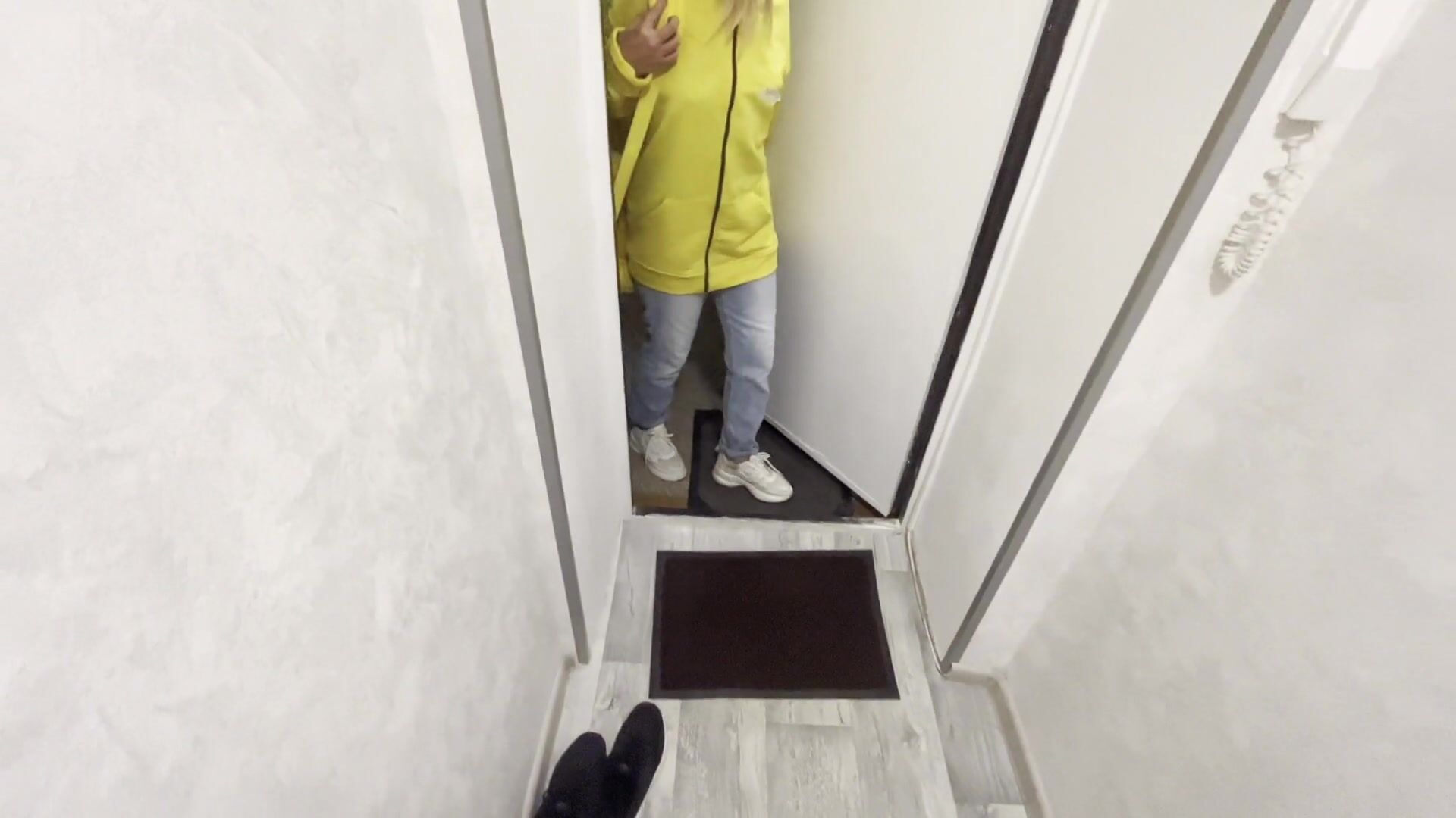 Junge Kurierin macht einen blowjob und fickt einen Mann im Flur