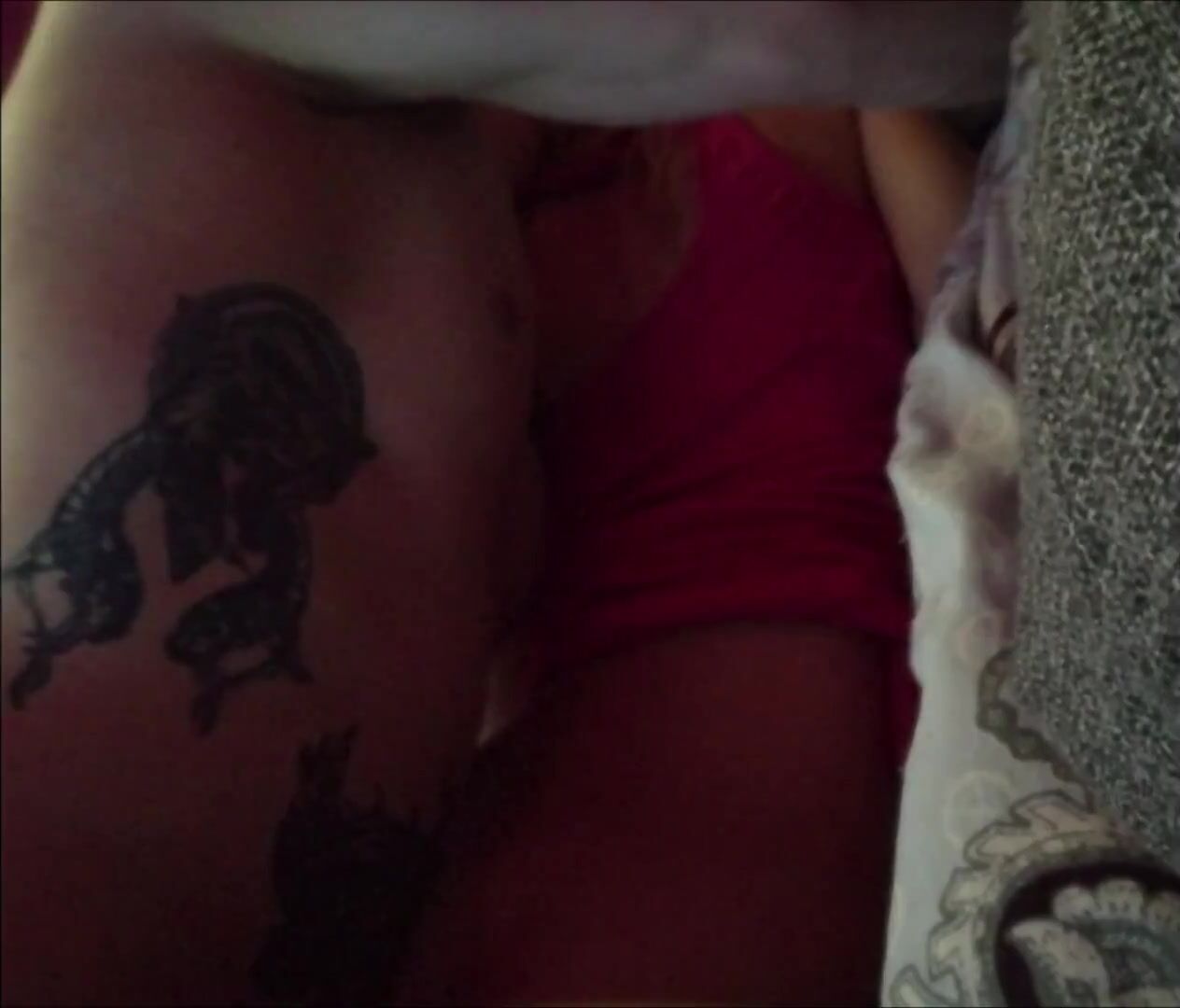 Tätowierter Mann hat vor der Kamera eine russische Süsse in einem Abendkleid auf einem nackten Körper