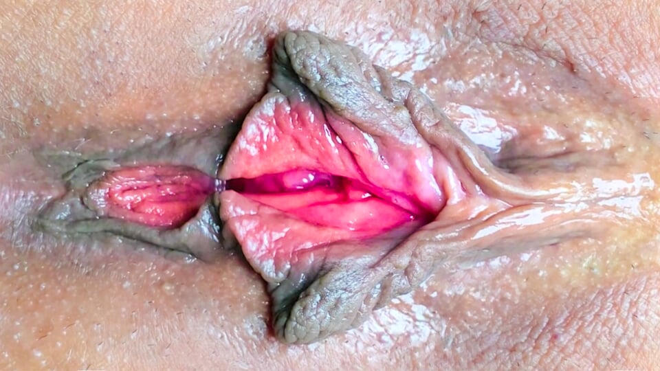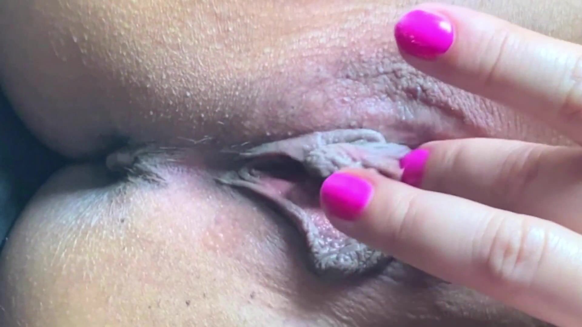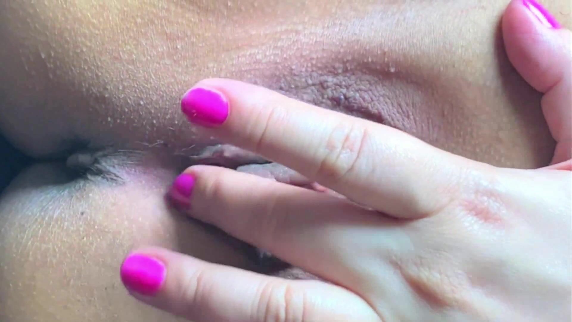Dama morena con manicura rosa se masturba el coño afeitado con los dedos frente a la lente de la cámara