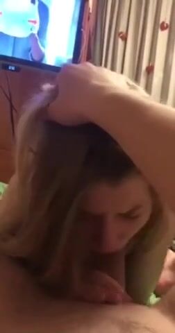 Blonde fille fait pipe et lèche boyrfend couilles, couché devant lui nu sur le lit
