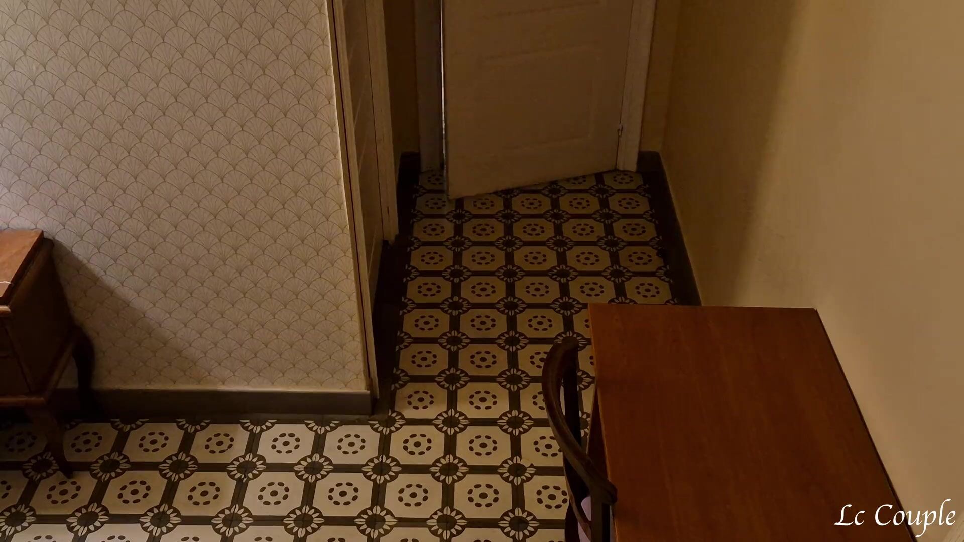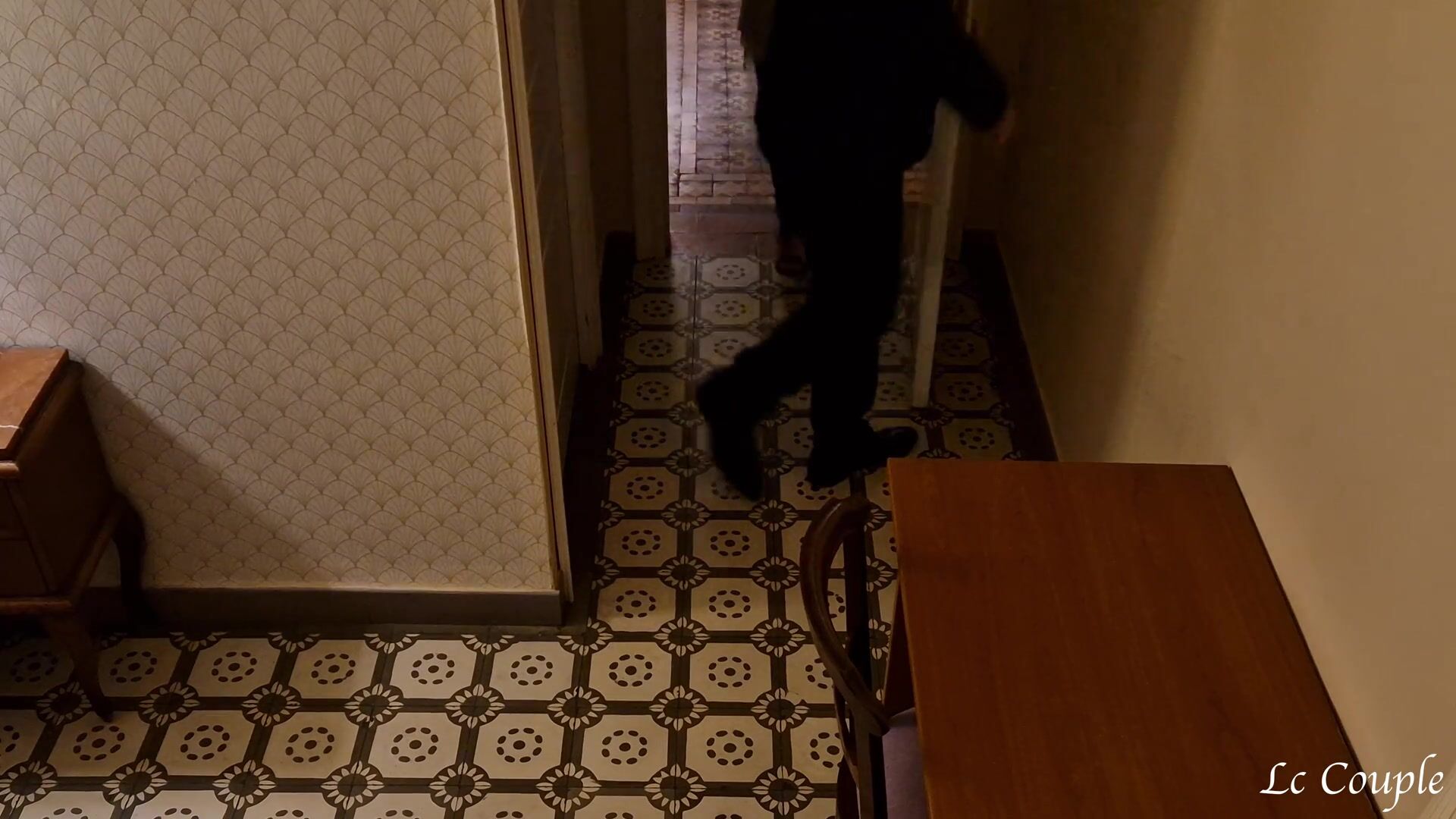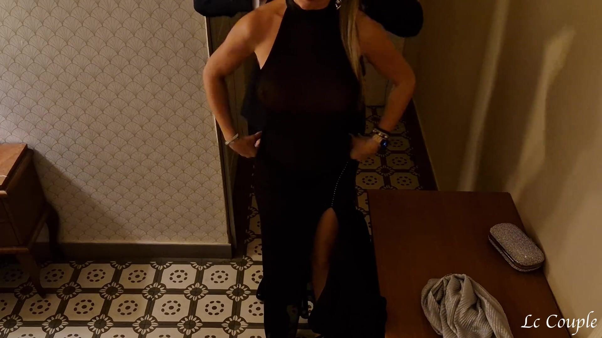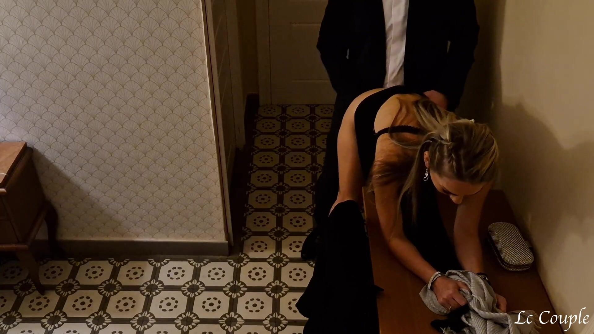 L'uomo ha da dietro nel bagno del ristorante una donna snella con seni di silicone e in alcune mutandine sotto il vestito da sera