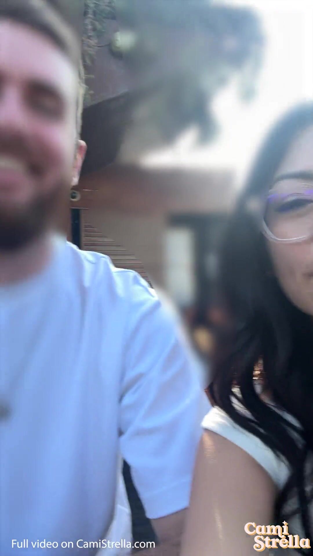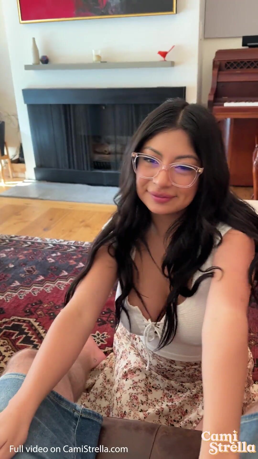 Cami Strella bruna con gli occhiali in canotta e perizoma succhia un grosso cazzo e scopa il suo amante in posizione Cowgirl al contrario